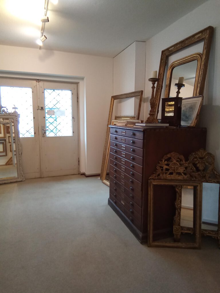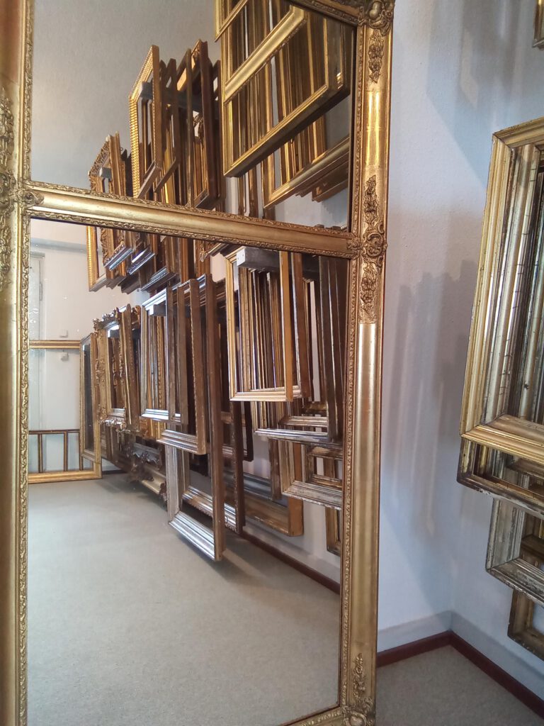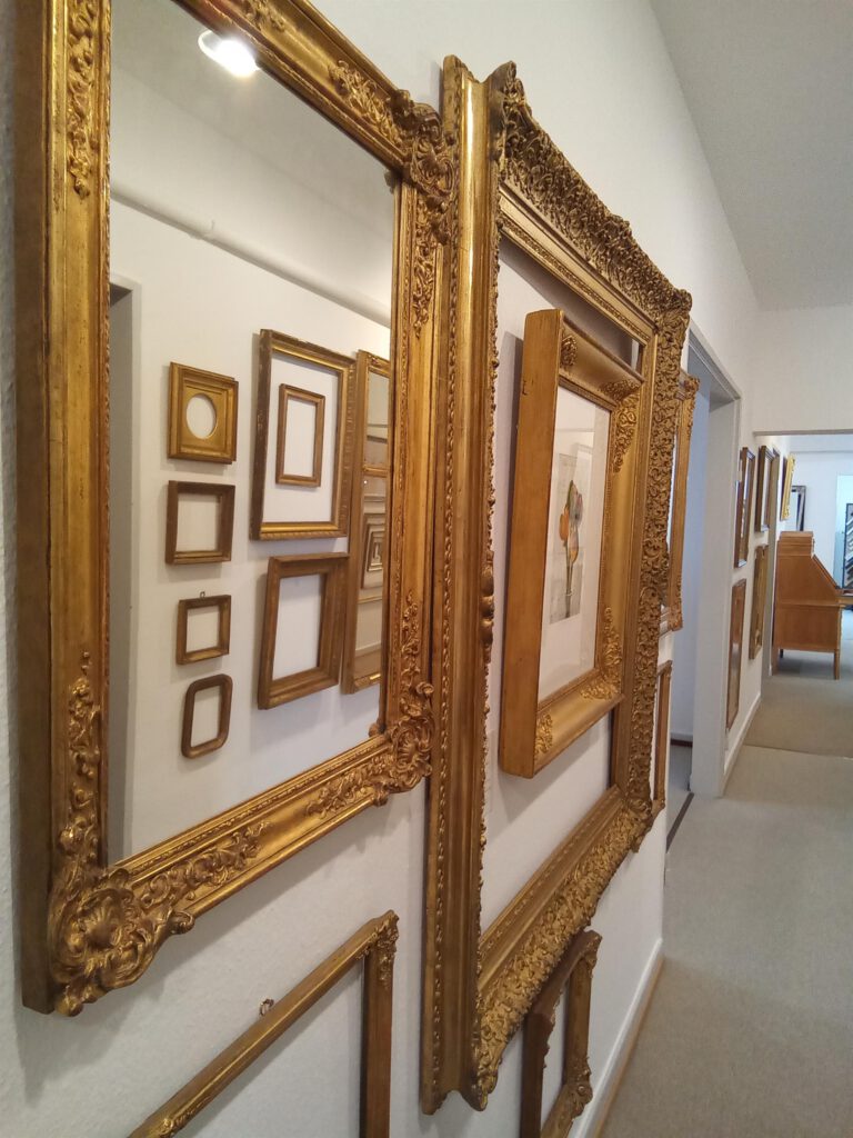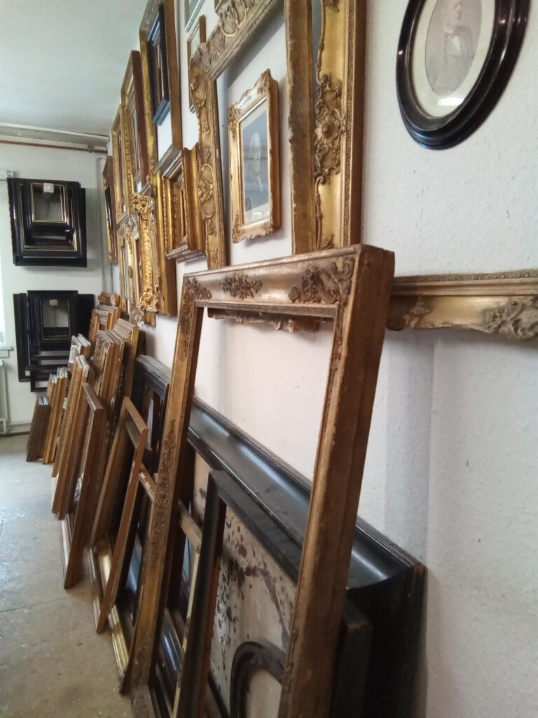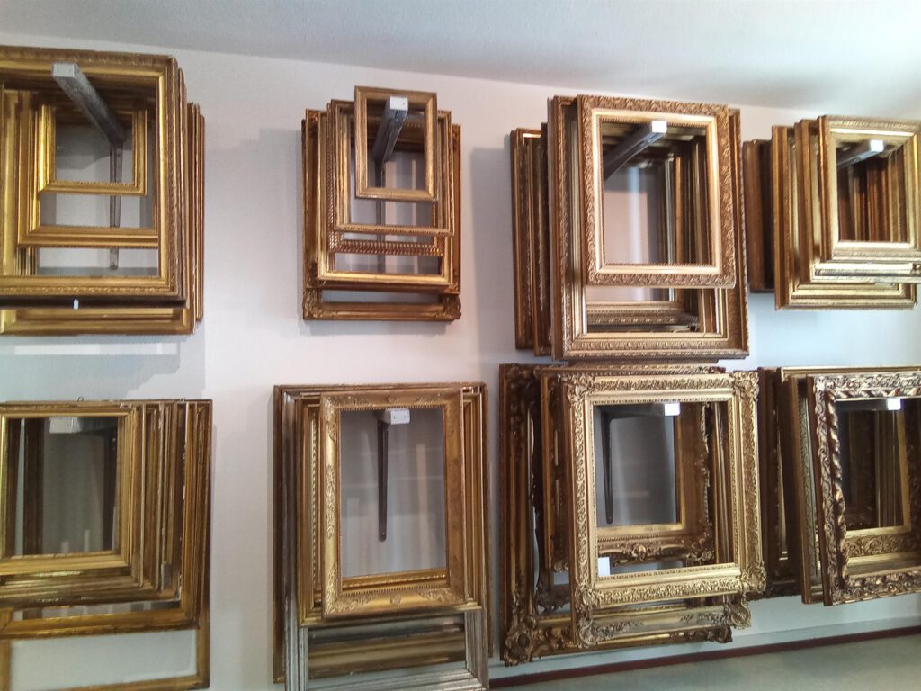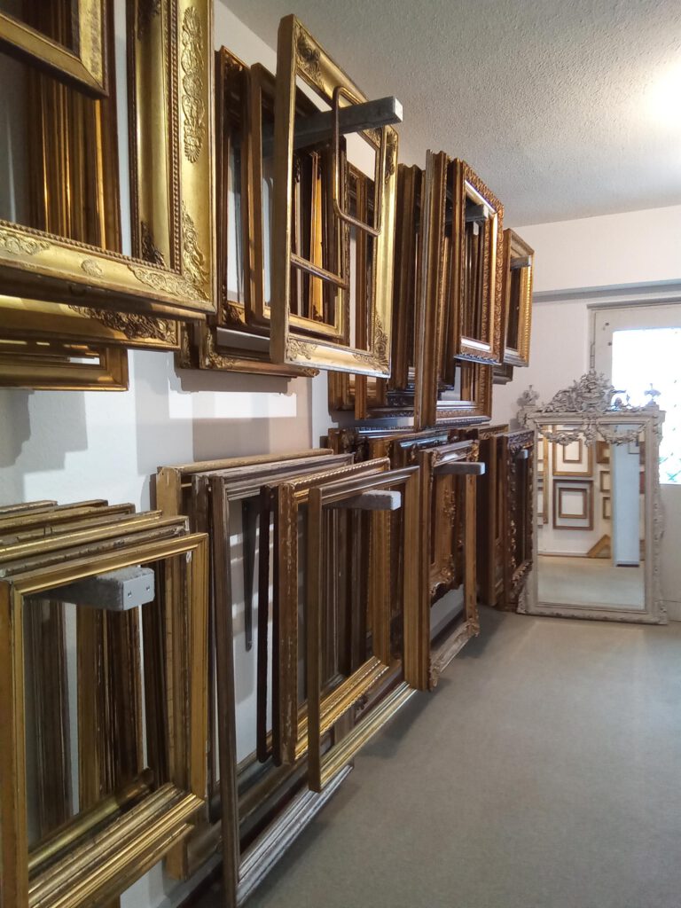 Das Sortiment an antiken Rahmen der Vergolderei erstreckt sich über viele Epochen bis zur Zeit des Jugendstils.