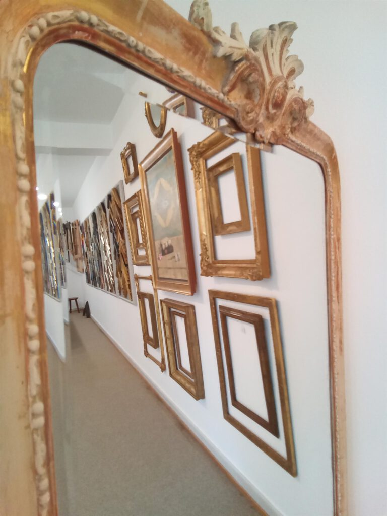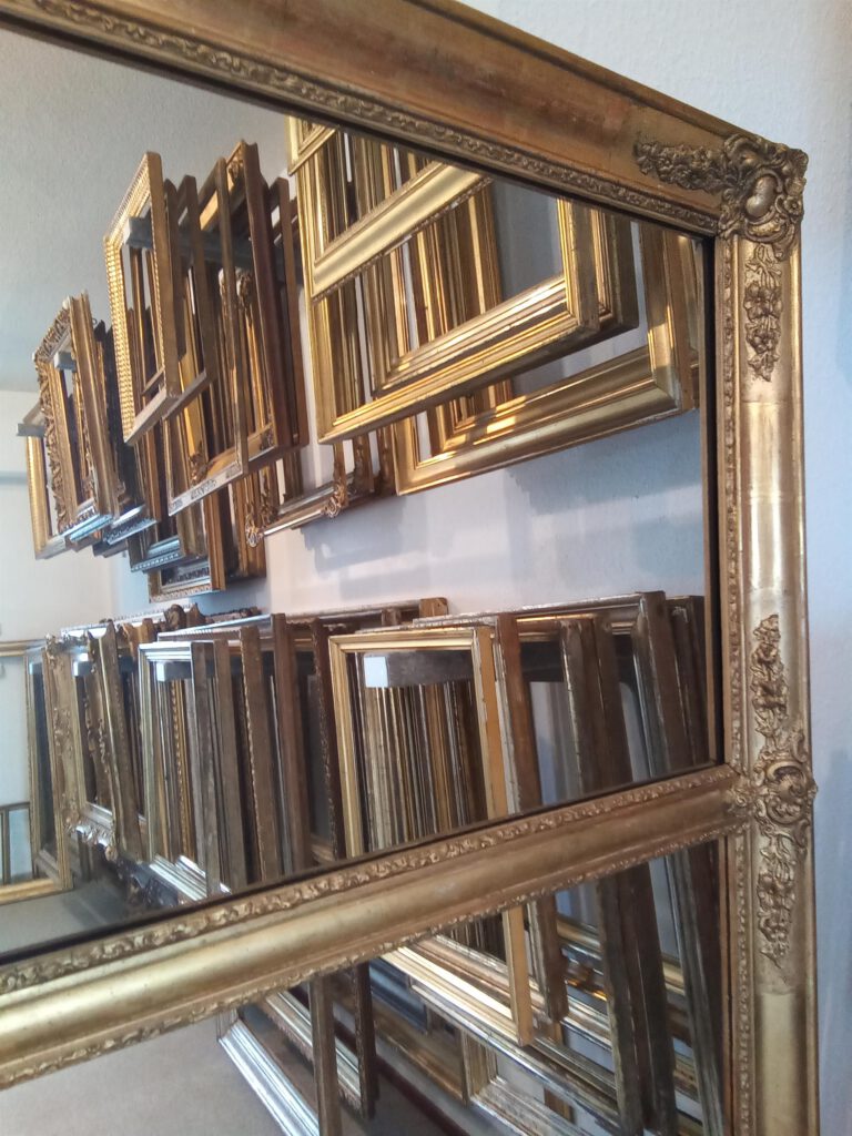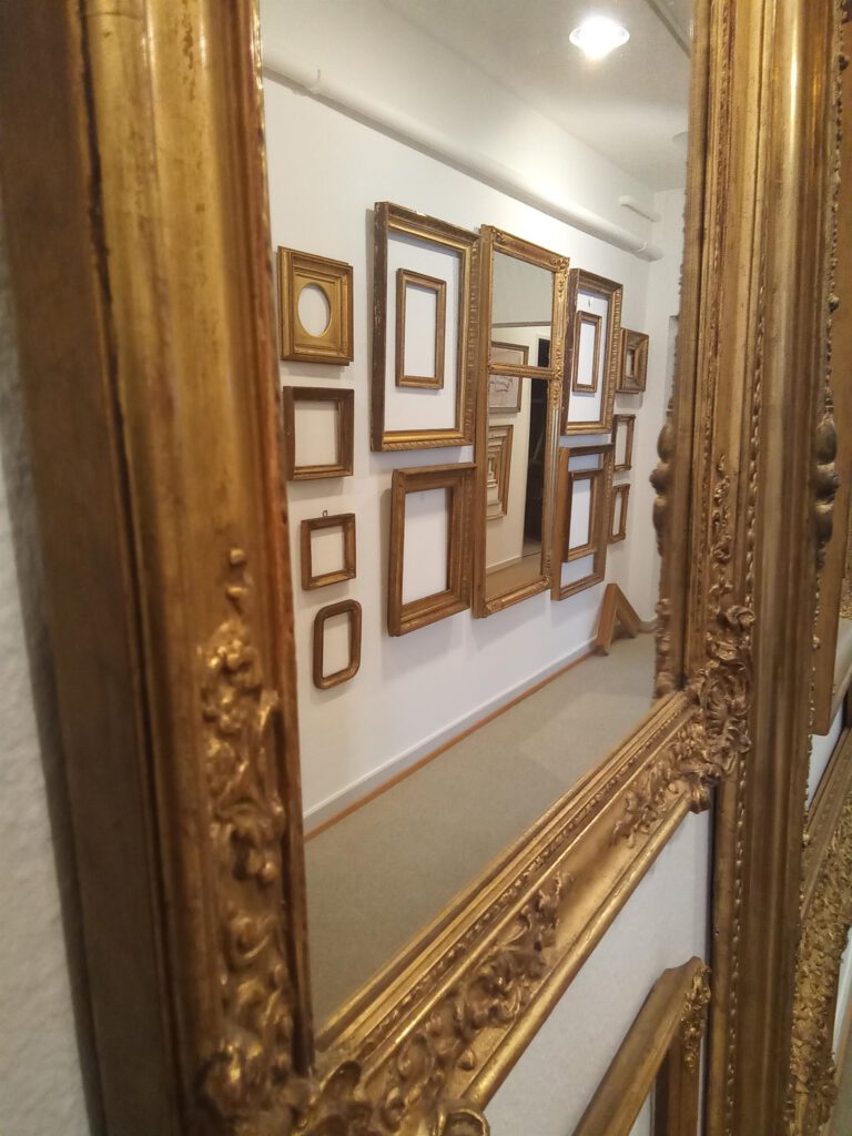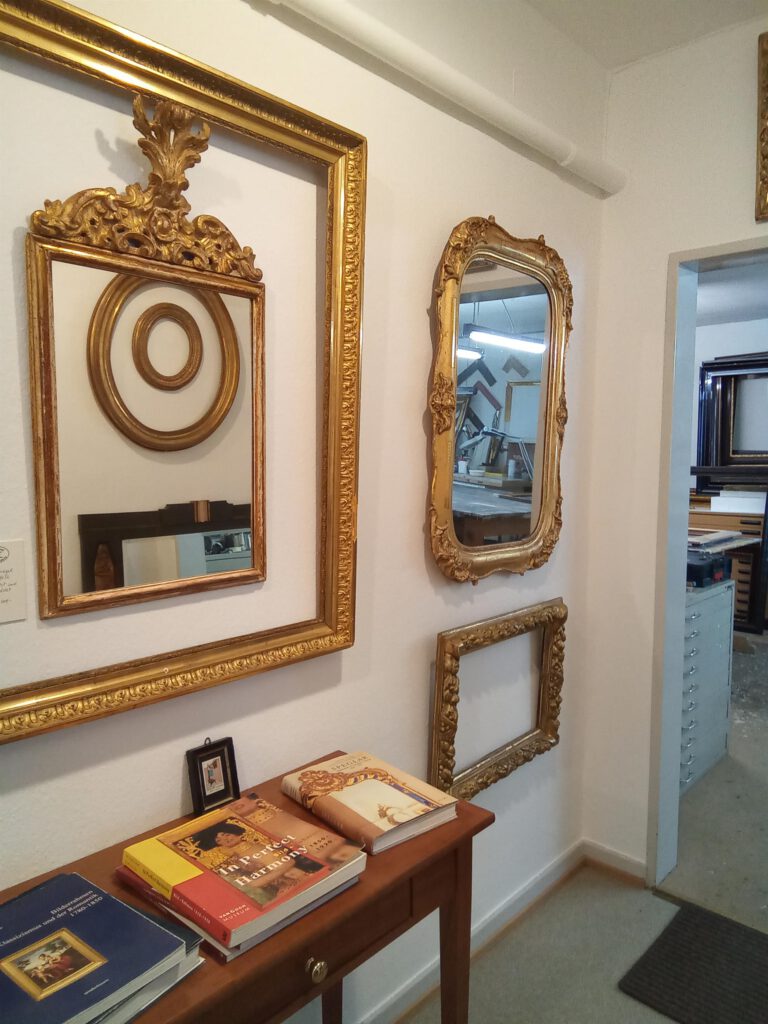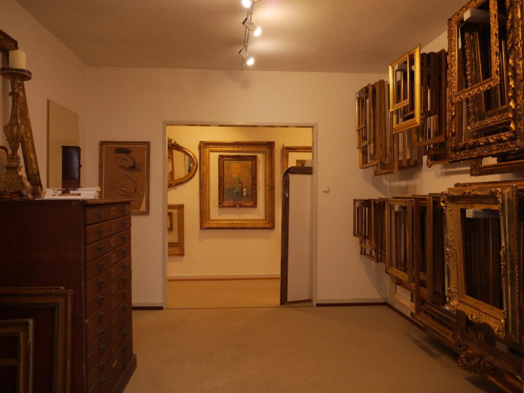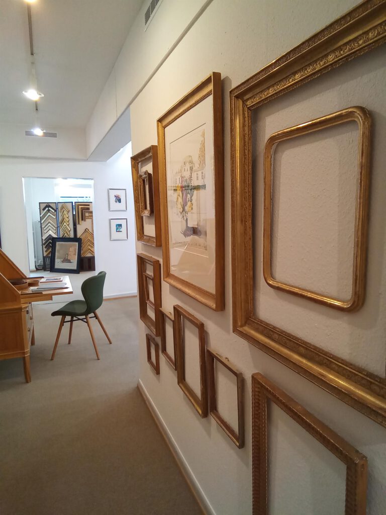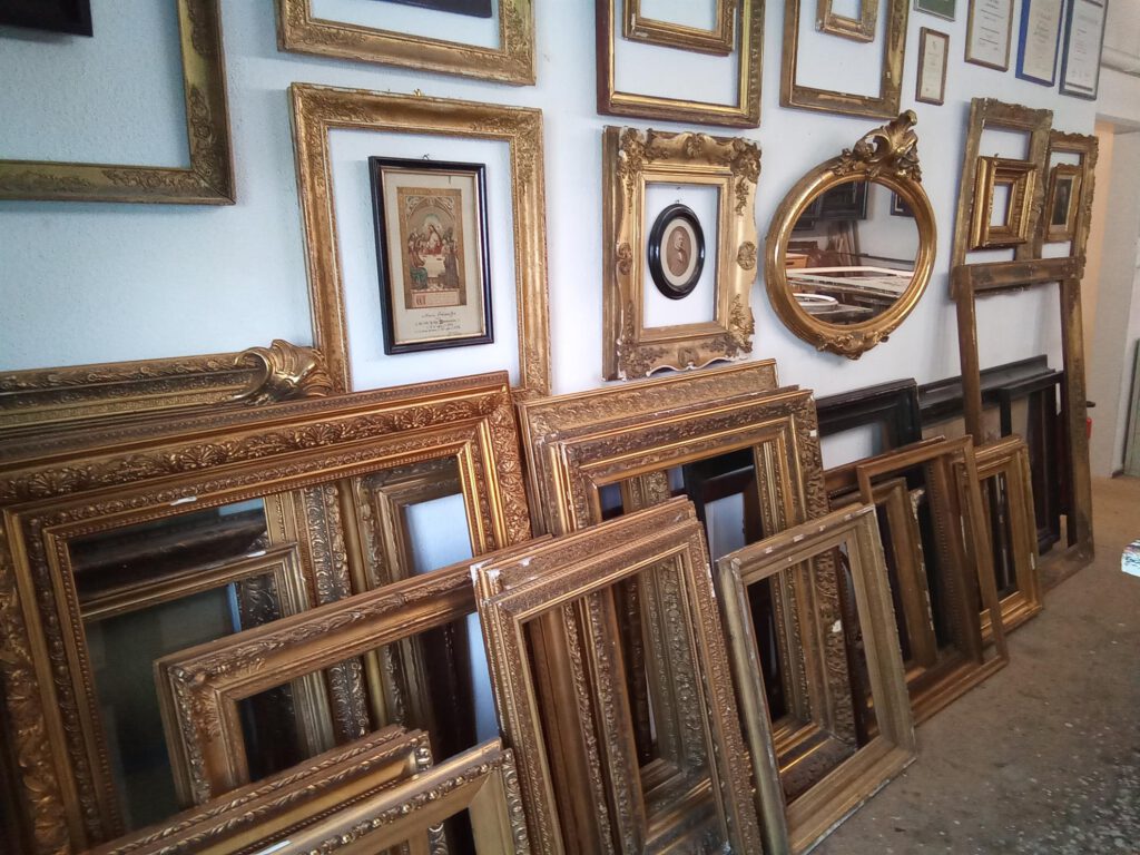 Das Sortiment an antiken Rahmen der Vergolderei erstreckt sich über viele Epochen bis zur Zeit des Jugendstils.